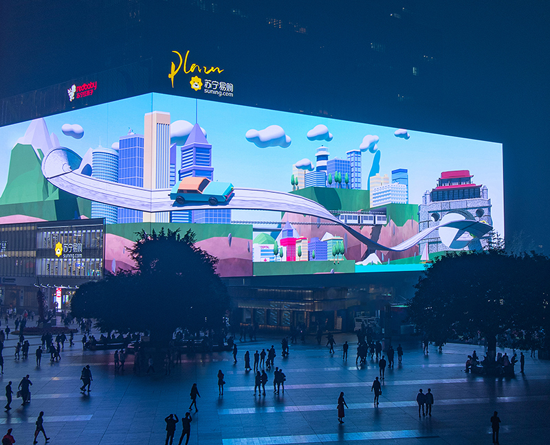 在夜游经济发展的当下,地标灯光秀成为聚焦人气的神器。特别是一些城市商业中心耀眼的地标灯光秀,瞬间就能吸引人们驻足观看,增加人们的消费欲望。目前市面上打造城市中心地标的显示屏种类蛮多,比如有LED网格屏,LED点光源,LED透明屏,LED贴膜屏,LED格栅屏、LED灯条屏等。一般综合应用领域、显示效果等方面,LED透明屏崭露头角。普遍来说透明LED屏通透率超过85%。与传统显示屏的厚实结构相比,它安装在建筑的玻璃幕墙上,可以提供大面积的采光和隐蔽效果。那么LED透明屏如何打造城市亮眼新地标呢
